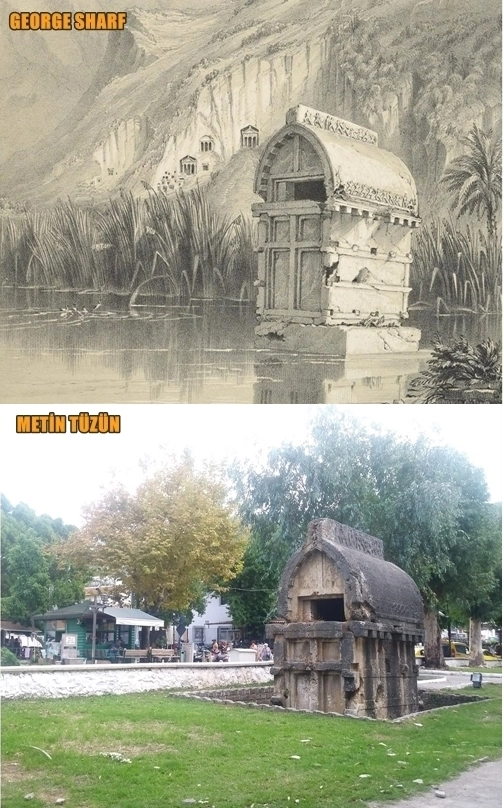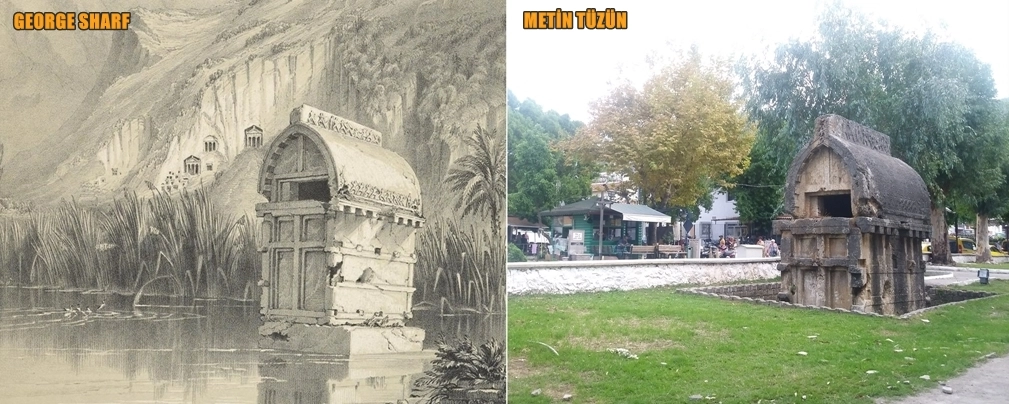 Fethiye'de ki bu kaya mezarları üzerinde elimde ki gravür arşivinden yararlanarak yaptığım çalışmalarında kimi kaya lahitlerin, gravürlerde deniz kıyısında görüldüğünün aksine bu lahitlerin kıyının ve bataklıkların doldurulmasıyla şimdi Fethiye şehir merkezi içinde kaldığı görülüyor. Görsellerde de bu fotoğrafları paylaşmaya çalıştım. Fethiye kaya mezarlarında herkesin bilmediği bir ayrıntı daha vardır. Arkeolog Charles Texier bu bölgeyi ziyaret ettiğinde ve yaptığı araştırmalar çalışmalar sonrasında ayrılmadan önce büyük mezarın sol üst kısmına kendi imzasını bırakmıştır. Görsellerde de göreceğiniz bu imzayı muhtemelen kendinden sonra gelecek olan gezgin ve arkeologlara bırakmış olması muhtemeldir.