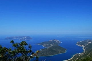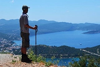 Yol oldukça düz ve açık bir alanda 2-3 km kadar yürüdükten sonra karşımda iki tepenin arasında ki yolun beni Kaş’a çıkaracağını düşünerek vadiye doğru tarlaların arasından geçiyorum bir süre daha. Vadiye yaklaştığımda işaretler beni sağımda ki ormanlık tepeye doğru tırmanışa geçiriyor. Kısa bodur ağaçlar arasında zikzak çizerek tırmanıyorum. Tırmanışım 30 dk. kadar sürdükten sonra Kaş ve ardında küçük adacıklardan oluşan muhteşem bir manzara karşılıyor beni.