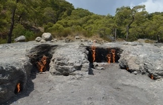Yanartaş doğal parkı özel işletmeye kiralandığı için girişte ücret ödüyorsunuz. Müze kart geçmiyor. Biletimi alıp sonradan yapılmış ama öncesinde antik yol olan bir taş merdivenlerden çıkmaya başlıyorum. Keyifli bir yol olsa da devamlı tırmandığınız için biraz yorucu. Ve 1 km çıkıştan sonra nihayet Yanartaş bölgesine ulaşıyorum. 500 m2’lik bir alana yayılmış bir bölge kaya kütlesinden oluşuyor. Ve birçok yerinden alevler çıkması ilginç bir manzara gerçekten. Bazı kaynaklarında kapatıldığı belli oluyor. Ama itiraf edeyim çok bakımsız buldum. Çevre düzenlemesi yapılırsa bu bölge daha fazla turist çekebilir. Günün ilk videosunu burada çekiyorum. Bu sırada benimle bölgeyi ziyaret eden Önder Bey ve eşi ile tanışıyorum. Biraz sohbet ediyoruz. Birlikte fotoğraf çektirip vedalaşıyoruz. Ve tepeye doğru tırmanışa devam ediyorum.