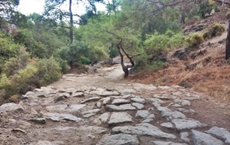 Tırmanış zaman zaman çok dikleşiyor. Bir süre bu tırmanış devam edecek. Sonra yamaçlardan ilerleyerek bulunduğunuz yerin tepe noktasına ulaşacaksınız. Orada bir kaya üzere sprey boya ile 7 km yazmışlar. Bu kayanın dibinden sola aşağı yol devam ediyor. İniş oldukça keyifli ve de güzel. Hiç zorlanmadan dere yatağına kadar iniyorum. Yol üzerinde yürüyüş yapan İtalyan bir aile ile karşılaşıyorum. Çocukların yaşları 4 ile 8 arasında, çocuklarını bu şekilde doğa kültürü aşılaması ve uzun bir parkura çıkartmasını görünce bizim kültürümüzde neden doğa sporları olmadığını daha iyi anlıyorum.